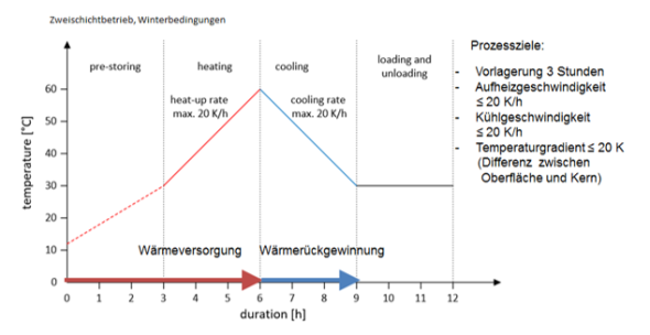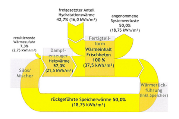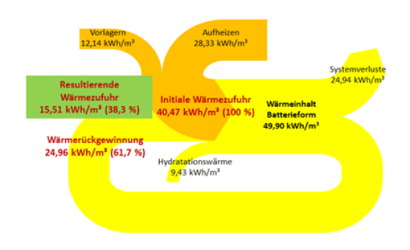 Durch Rückführung, Speicherung und Nutzung bisher ungenutzter industrieller Abwärme in den Prozess der wärmebeschleunigten Betonfertigteilherstellung wird der Energieverbrauch bei gleichzeitiger Qualitätssteigerung der erzeugten Produkte um ca. 50 % gesenkt. Mit dem innovativen Verfahren wird neben der Energieeffizienz die kontrollierte Einhaltung der Wärmebehandlungsrichtlinie DAfStb nachweisbar und zertifizierbar gewährleistet. Durch die thermische Prozesskontrolle wird die Gefügequalität der Betonelemente verbessert und deren Lebensdauer erhöht.