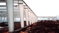 Das Stahlskelett der Halle, hier während der Montage, besteht aus Blechträgerstützen mit Walzträgerbindern auf Streifenfundament. |